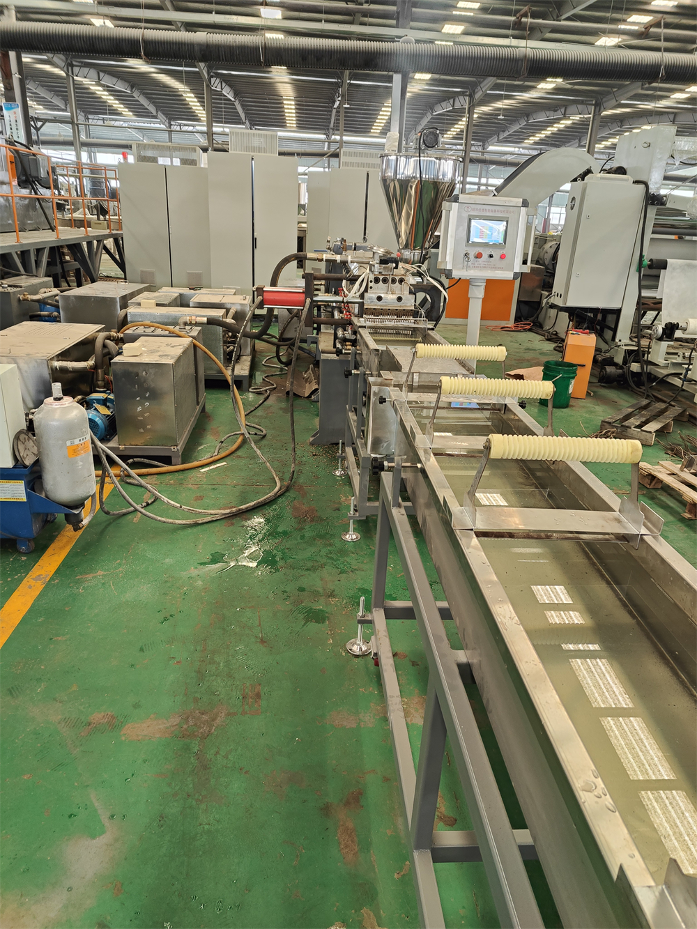 一、系統(tǒng)機(jī)組技術(shù)參數(shù)Ⅰ、機(jī)器顏色:主機(jī)為公司標(biāo)色;電柜為電腦色Ⅱ、造粒工藝:雙螺桿計(jì)量式喂料——-JDL-65D雙螺桿擠出機(jī)---—鉸鏈快開(kāi)換網(wǎng)——拉條機(jī)頭----6米不銹鋼水槽-----吹干機(jī)----龍門(mén)切粒機(jī)------主機(jī)采用:PLC控制 Ⅲ、作業(yè)物料:PET+色粉 產(chǎn) 量:200-250公斤/小時(shí)(作業(yè)條件不同,產(chǎn)量稍有不同)雙螺桿造粒機(jī)_省電20%_佳德塑機(jī)客戶(hù)為何購(gòu)買(mǎi)我們?cè)O(shè)備,我們價(jià)位在行業(yè)屬于中低價(jià)格,我們?cè)O(shè)備能給客戶(hù)帶來(lái)哪里利益,我們?cè)O(shè)備能給用戶(hù)帶來(lái)以下利益:1.特點(diǎn):這套設(shè)備主機(jī)是環(huán)保型;主機(jī)設(shè)備不需要接外循環(huán)水系統(tǒng);自帶循環(huán)冷卻統(tǒng)是我公司專(zhuān)利產(chǎn)品,2.雙螺桿齒輪箱冷卻采用:采用環(huán)保冷卻系統(tǒng)(環(huán)保型:發(fā)明專(zhuān)利號(hào):CN201911312134.6)不需要接外循環(huán)水冷卻,不用徘外水;采用閉環(huán)循環(huán)系統(tǒng),不用擔(dān)心長(zhǎng)時(shí)間使用水冷卻會(huì)產(chǎn)生水垢把冷卻器堵住,導(dǎo)致齒輪箱損壞3.雙螺桿主機(jī)水箱冷卻系統(tǒng)采用:采用環(huán)保冷卻系統(tǒng)(環(huán)保型:發(fā)明專(zhuān)利號(hào):CN201911312134.6)不需要接外循環(huán)水冷卻,不用徘外水;采用閉環(huán)循環(huán)系統(tǒng)4.節(jié)能:普通筒體筒體冷卻;例如:第5區(qū)溫度超高;這是電子閥導(dǎo)通;第5區(qū)冷卻回水就會(huì)影響第六區(qū)和第四區(qū)的溫度下降;就會(huì)導(dǎo)致第四六區(qū)加溫;這種情況會(huì)一直循環(huán)出現(xiàn);導(dǎo)致電費(fèi)浪費(fèi);我們現(xiàn)在采用環(huán)保型就徹底解決這個(gè)問(wèn)題;加我們委托第三方開(kāi)發(fā)溫控模塊,溫控加熱系統(tǒng)比同類(lèi)設(shè)備節(jié)能:10-20%電費(fèi),就是每噸能為客戶(hù)節(jié)省電費(fèi)10元,每年大概能節(jié)約電費(fèi)2萬(wàn)5.雙螺桿齒輪箱采用:高扭D型齒輪箱